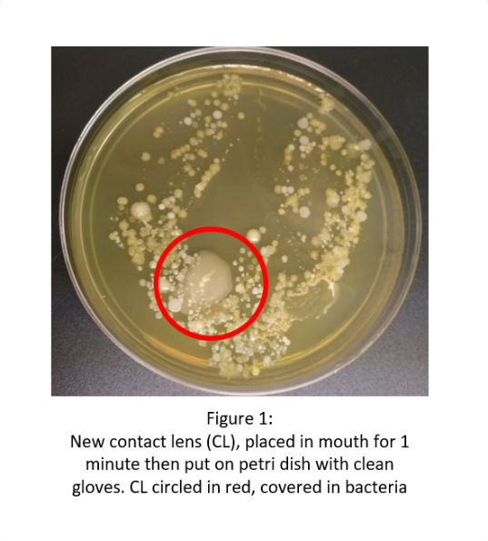 To demonstrate the rapid growth of bacteria associated with mishandling contact lenses, CORE researchers exposed new, clean contact lenses to human saliva and then placed them into petri plates for monitoring. The action of putting a contact lens in the mouth resulted in significant growth of microorganisms after only two days of incubation (Figure 1).