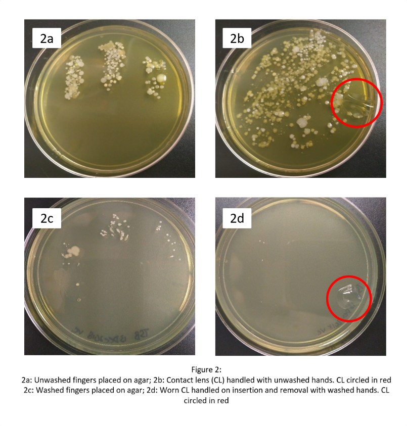 They then examined the effect of handling contact lenses with both clean and unwashed hands. Unwashed hands were pressed into agar (Figure 2a), and also used to handle a new contact lens (Figure 2b). Scientists then repeated the procedure after following recommended handwashing practices, touching both the agar directly, along with applying and